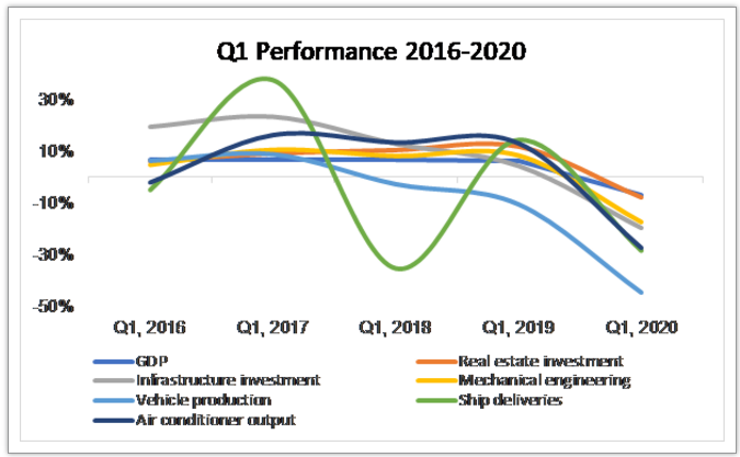 其中包括:GDP下降6.8%,房地產投資下降7.7%,基建投資下降19.7%,通用機械下降17.2%,汽車產量下降44.6%,船舶交貨量下降28.5%,空調產量下降27.5%。
