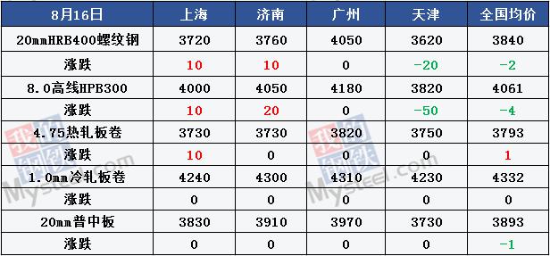 Macro-information The National Development and Reform Commission held a press conference on macroeconomic performance: & GT; & GT; In July, CPI and PPI were in a moderate range, and prices are expected to remain stable for some time to come. & GT; & GT; In response to the apparent increase in food prices, several provinces have issued temporary subsidies in a timely manner. We will promptly issue and implement the Action Plan for Promoting the Reasonable Growth of Income of Urban and Rural Residents(2019-2020), so as to increase the income of residents and increase their ability to consume. & GT; & GT; From January to July, electricity consumption for the whole of China was 4.1 trillion kilowatt-hours, an increase of 4.6 % year-on-year. Among them, primary, secondary, tertiary and residential electricity consumption increased by 5.2 percent, 2.8 percent, 9.1 percent and 8.8 percent respectively, respectively, while tertiary and residential electricity consumption continued to grow rapidly. ○ Ministry of Finance: From January to July, corporate income tax totaled 3036.9 billion yuan, an increase of 4 % year-on-year. Individual income tax was 643.3 billion yuan, down 30.3 % year-on-year. ○ Foreign Exchange Bureau: In the second quarter, domestic financial institutions made a net outflow of 7.508 billion yuan to foreign direct investment, and foreign investors made a net inflow of 10.134 billion yuan to domestic financial institutions. Central Bank: In July, the bond market issued 3.9 trillion yuan of various types of bonds; Inter-bank money market transactions totaled 90.6 trillion yuan, an increase of 17.23 % year-on-year, and an increase of 21.74 % over the previous month. The average monthly interest rate on interbank lending was 2.08 %, which was 38 basis points higher than the previous month. The State Administration of Taxation, the Ministry of Finance and the General Administration of Customs decided to promote the pilot project of the general taxpayer qualification of value-added tax in the comprehensive bonded area. <UNK> Hainan: From August 16th to the end of the year, it launched the "Action to Ensure the Sustainable and Healthy Development of the Economy of the Province, Ensure the Full Implementation of All Reform Policies", aimed at accelerating the development of kinetic energy transformation and accelerating the construction of free trade zones(Hong Kong). 031. Renminbi exchange rate: The central price of the renminbi against the US dollar was 7.0312, which was 44 basis points lower than the previous trading day. <UNK> SHIBOR: overnight shibor reported 2.6650 %, an increase of 0.60 basis points; 7 days shibor reported 2.6730 %, a decrease of 0.50 basis points; Shibor reported 2.6660 % in three months, up 0.50 basis points. Spot market Futures stock market Industry News <UNK> Building materials trading volume: On August 16, Mysteel's daily trading volume of building materials for traders across the country was 194,800 tons, an increase of 20,500 tons from August 15. <UNK> Iron ore turnover: On August 16th, the total number of iron ore deposits in the country's main port was 82,400 tons, a decrease of 31.79 % over the ring; The average daily turnover last week was 1.063 million tons, and the average daily turnover last month was 1.1289 million tons. Mysteelshenyibing: Demand for steel in the off season is still erratic, and this week's fall in steel inventories eased pessimism, but the road to deconversion remains bumpy. It is expected that short-term steel prices will not rebound strongly, and there are still repeated shocks. -Mysteel Research: & GT; & GT; Sample of 230 independent focus companies: capacity utilization rate 74.66 %, a decrease of 0.84 %; The average daily output of 667,800 tons decreased by 7,500 tons; The coke inventory was 752,400 tons, a decrease of 55,400 tons; The total inventory of coking coal was 14,363,600 tons, an increase of 18,800 tons, and the average number of days available was 16.17 days, an increase of 0.20 days. & GT; & GT; The iron ore inventory of 45 ports was 1,601.24, which was 249.51; The average daily total of 254.65 Hong Kong dropped 39.24. & GT; & GT; The blast furnace operating rate of 247 steel mills was 81.07 %, and the ring was down by 1.63 %, an increase of 2.32 % year-on-year; The utilization rate of blast furnace ironmaking capacity was 82.25 %, the ring ratio increased by 0.21 %, the year-on-year increase was 3.1 %, the profit rate of steel mills was 78.14 %, the ring ratio was 6.48 %, and the average daily iron water output was 2.3002 million tons, and the ring ratio was increased by 0.66 million tons, a year-on-year increase of 86,600 tons. Effect of production restriction on scrap steel demand: & GT; & GT; Sichuan region: According to Mysteel's understanding, the inventory of the mainstream arc furnace factory in Sichuan is currently low, the consumption is also much lower than normal, and the cumulative consumption is reduced by 0.5-9 ,500 tons/day. Details & GT; & GT; & GT; & GT; Shandong region: According to Mysteel's understanding, the daily reduction of waste steel usage in Shandong is 0.65-7 ,400 tons, mainly by reducing the use of waste steel in the converter. Details & GT; & GT; <UNK> Hebei Bureau of Industry and Information Technology issued a production capacity replacement plan announcement: & GT; & GT; Xingtai Iron and Steel Co., Ltd. plans to start construction of two new 1200 M3 blast furnaces with a production capacity of 2.26 million tons on May 31, 2019; 100t converter 2, production capacity 2.3 million tons. & GT; & GT; Tangshan Guotang Iron and Steel Co., Ltd. plans to build a new coal cake volume of 67 cubic meters 16 * 18 holes of heat recovery Coke furnace, production capacity of 1.76 million tons. ○ Xuzhou Ecological Environment Bureau: Published the "Xuzhou City to Further Strengthen the Work Plan for the Prevention and Control of Air Pollution", and proposed that since August, We will examine